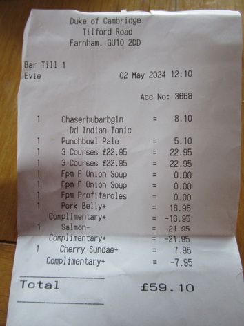 We thought we would try to go for the 3 course lunch at the Duke of Cambridge, next door to the Lodge park. Mal decided if the same mains were crossed off the set menu today, he would complain. Yes, as we had gone in at 12, obviously they hadn’t sold out but all that was left was the veggie or steak, the same as the previous day. So, Mal told the waitress we would put on Trip Advisor not to go by the menu they have online as a lot is missing. She did no more than spoke to the Manager who said he would substitute the fish and the pork from the a la carte menu at no extra cost!! You can’t say fairer than that. So, we ended up with an expensive menu for the cost of their set menu! I have to say the food was delicious. We were slightly gob smacked that he made such a generous offer.