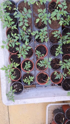 Another lovely sunny day and time to repot my masses of tomato plants. I just use the seeds from a Piccolo tomato and they are not the easiest to separate and so I get far too many plants. Mal took a lot to the allotment.
